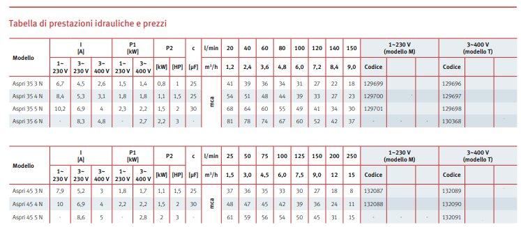 APPLICAZIONIPer acque pulite in applicazioni domestiche, irrigazione e pressurizzazioneMATERIALICorpo pompa e giranti in acciaio inossidabile AISI 304. Aspirazione e mandata in ghisa. Diffusori: Noryl caricato in fibra di vetro. Albero motore in acciaio inossidabile AISI 420. Tenuta meccanica in grafite e allumina. Guarnizioni di tenuta in NBR. Valvola di autoadescamento interna insensibile alle piccole impurità. Aspri 35N: Asse del motore in acciaio inossidabile AISI 420 e acciaio F-114. Carcassa del motore in alluminio. Aspri 45N: Carcassa del motore in alluminio L-2521.MOTOREAsincrono, due poli. Isolamento classe F. Protezione IP X5. Servizio continuo.LIMITI DI UTILIZZOTemperatura massima del liquido: 40° C