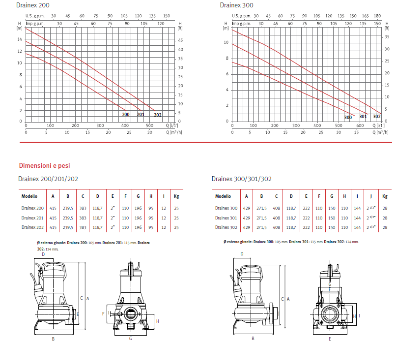 APPLICAZIONIDrenaggio di acque cariche. Drenaggio da fosse settiche e da piccoli impianti di depurazione. MATERIALICorpo pompa e girante vortex in ghisa. Piedi pompa (smontabili) in acciaio inossidabile AISI 304. Doppia tenuta meccanica in grafite e steatite. Guarnizione a labbro in NBR. MOTOREAsincrono, due poli. Isolamento classe F. Protezione IP 68. Servizio continuo. La versione monofase comprende protezione termica e condensatore. LIMITI DI UTILIZZOSezione massima di passaggio: Drainex200: 45 mm. Drainex300: 60 mm. Temperatura massima del liquido: 40 °C. DOTAZIONIGomito filettato fornito con la pompa. Drainex M: senza galleggiante. Drainex M A: con galleggiante Ampio spazio tra la girante e il cono di aspirazione che consente il passaggio di particelle solide in sospensione.