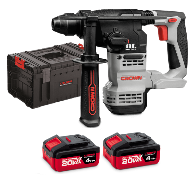 DATI TECNICI - Tipo di batteria Lithium-ion - Voltaggio 20 V Max. * - Capacità batteria 4 Ah - Tempo di ricarica della batteria 60 min - Velocità a vuoto 0-1400 minˉ¹ - Percussioni al minuto 0-4500 minˉ¹ - Energia del colpo 2,3 J - Tipo di mandrino SDS-PLUS - Capacità di foratura nel calcestruzzo 18 mm - Capacità di foratura nel ferro 13 mm - Capacità di foratura nel legno 20 mm - Peso 3,11 kg * La tensione massima iniziale della batteria (misurata senza carico di lavoro) è 20 volt. La tensione nominale è 18 volt. IN DOTAZIONE - 2 Batterie - 1 Caricabatterie - Impugnatura supplementare - Limitatore di profondità - Valigia