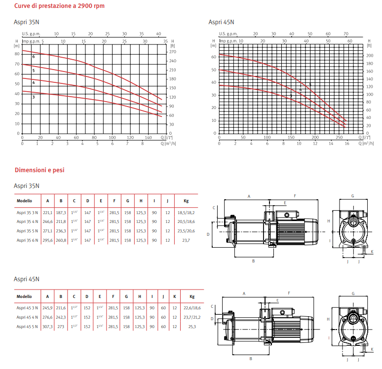 APPLICAZIONIPer acque pulite in applicazioni domestiche, irrigazione e pressurizzazioneMATERIALICorpo pompa e giranti in acciaio inossidabile AISI 304. Aspirazione e mandata in ghisa. Diffusori: Noryl caricato in fibra di vetro. Albero motore in acciaio inossidabile AISI 420. Tenuta meccanica in grafite e allumina. Guarnizioni di tenuta in NBR. Valvola di autoadescamento interna insensibile alle piccole impurità. Aspri 35N: Asse del motore in acciaio inossidabile AISI 420 e acciaio F-114. Carcassa del motore in alluminio. Aspri 45N: Carcassa del motore in alluminio L-2521.MOTOREAsincrono, due poli. Isolamento classe F. Protezione IP X5. Servizio continuo.LIMITI DI UTILIZZOTemperatura massima del liquido: 40° C