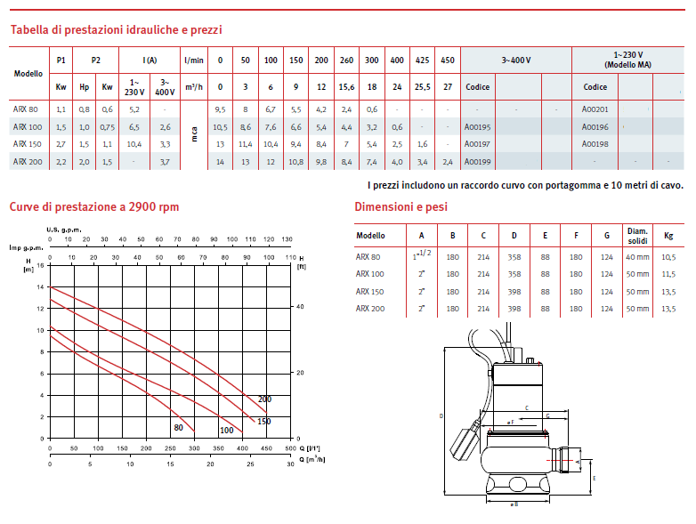 APPLICAZIONIParticolarmente indicata per rimuovere acque luride anche con corpi in sospensione grazie a una girante del tipo vortex. MATERIALICorpo pompa, piedino, girante, camicia, coperchio e manico in acciaio inossidabile AISI 304. Albero motore lato pompa in acciaio inossidabile AISI 316. O ring in NBR Tenuta meccanica lato pompa in carburo di silicio e allumina ed anello NBR lato motore.DOTAZIONE10 m di cavo d’alimentazione. Condensatore incorporato. MA: con interruttore di livello