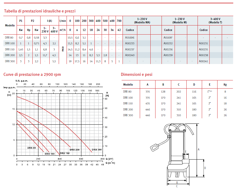 APPLICAZIONI Svuotamento di fosse di decantazione, pozzi neri, pozzi di raccolta liquami, pompaggio di acque luride con corpi solidi in sospensione grazie alla girante tipo vortex. MOTORE Asincrono, due poli in bagno d’olio. Isolamento classe F. Grado di Protezione IP 68. Versioni monofase con protezione termica incorporata. MATERIALI Carcassa motore e bulloneria in Aisi 304. Flangia portamotore, corpo pompa e girante in ghisa (G25). Tenuta meccanica in carboceramica (carburo di silicio / carburo di silicio per la versione 200 e 300) e paraolio. Guarnizioni or in NBR. Albero motore in Aisi 420. DOTAZIONE 10 m di cavo d’alimentazione H07 RNF. I modelli monofase 80, 100 e 150 hanno il condensatore incorporato mentre i modello 200 ha il condensatore esterno. I modello 200 e 300 sono forniti completi di quadretto di avviamento e motoprotettore. MA: con interruttore di livello. LIMITI DI UTILIZZO Sezione di passaggio: 35 mm (mod. 80, 100 e 150), 50mm (mod. 200 e 300). Profondità massima d’immersione: 9 m. Temperatura massima del liquido pompato: 40 °C con pompa totalmente immersa.